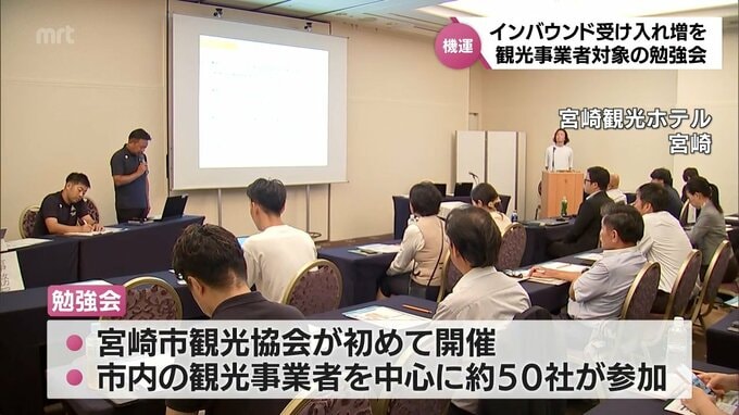 インバウンド客の受け入れの機運を高めようと、観光事業者を対象とした勉強会が宮崎市で開かれました。この勉強会は、宮崎市観光協会が初めて開いたもので、市内の観光事業者を中心におよそ50社が参加しました。勉…