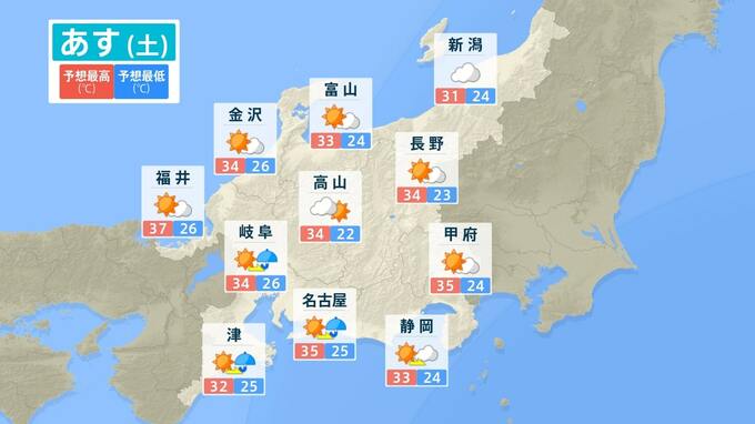 関東甲信地方は、晴れや曇りで、雨や雷雨となって激しく降っている所があります。あすも高気圧に覆われますが、気圧の谷や湿った空気の影響を受ける見込みです。このため、曇りや晴れで、雨や雷雨となり激しく降る所があるでしょう。