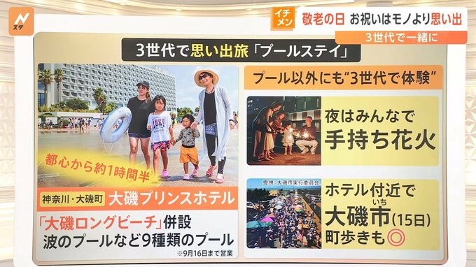 また、プール以外でも“3世代で体験”ができるとして、夜にホテルの敷地内で手持ち花火を楽しんだり、9月15日にホテル付近で開かれる「大磯市」というイベントでは、約190店舗の出店が出る予定で、町歩きも楽しむ事ができます。