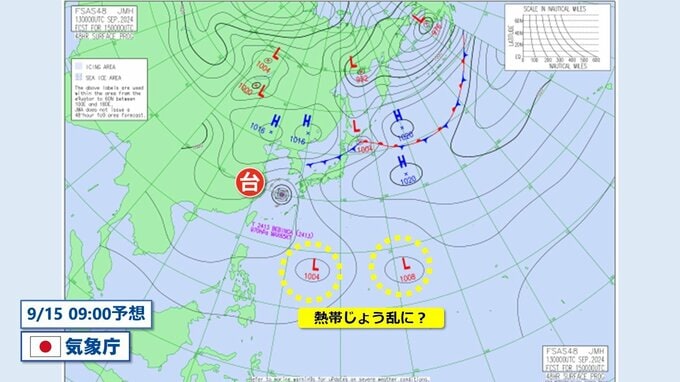 15日(日)9時の予想天気図では、日本の南の海上に2つの低圧部が発生すると予想されています。これらの低圧部で雲がさらにまとまって低気圧性の循環が強まれば熱帯低気圧や台風になる可能性が出てきます。