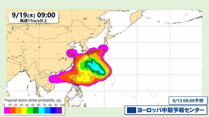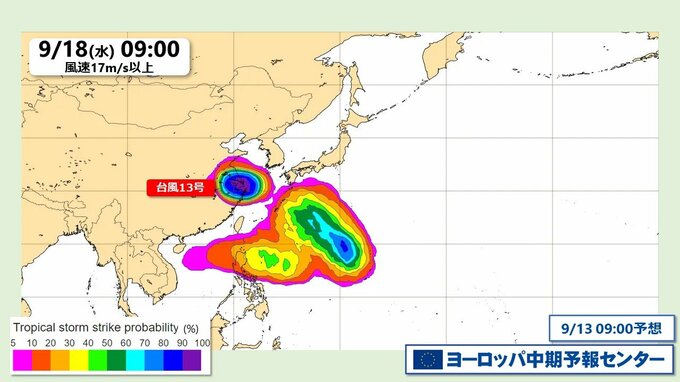 この3連休に台風13号が南西諸島を通過して大陸方面へと向かったあと、日本の南の海上で熱帯低気圧が発生する確率が高くなっているエリアが現れています。これは13号の次に別の熱帯じょう乱が発生する可能性を示しています。