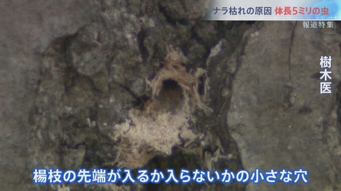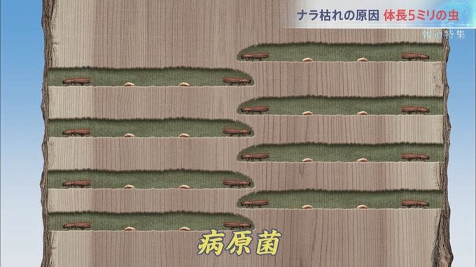カシナガは繁殖に適した弱った木を見つけるとまず数匹が入り込み、フェロモンで仲間を集め、一斉に襲う。いわば虫の総攻撃で、幹に大量の穴を開けた上に病原菌を運び込む。