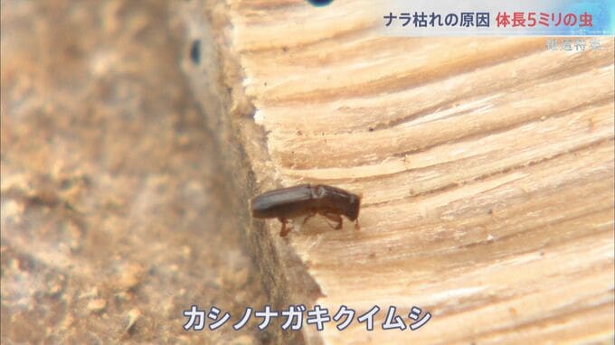 体長5ミリほどの小さな昆虫「カシノナガキクイムシ」。