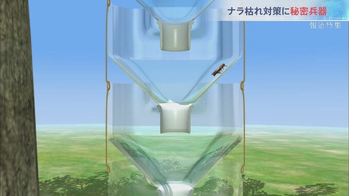 先端3分の1に切ったペットボトルを繋げて幹につるす。すると仲間のフェロモンに誘われてきたカシナガが当たって入る。足を滑らせ、エタノールを入れた捕獲箱に落ちる仕組みだ。