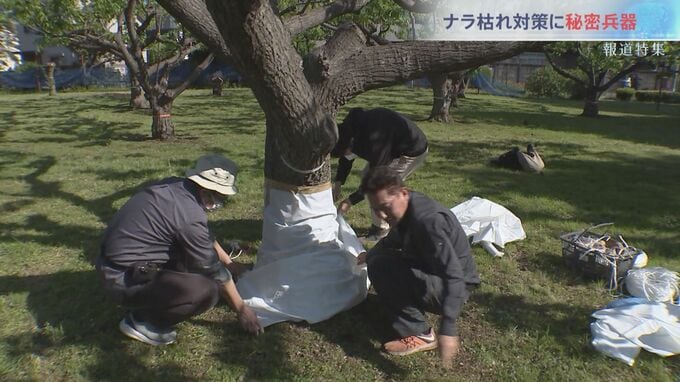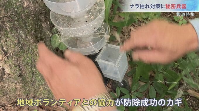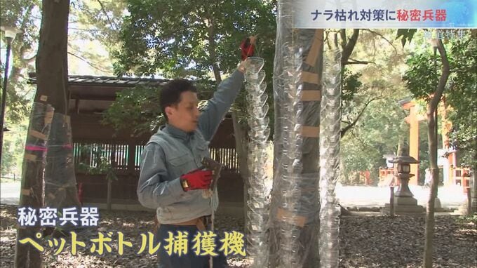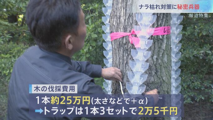 4月に防除のためのトラップなどを設置した。これまでに4万匹を超えるカシナガが捕獲されている。木が5本枯れてもおかしくない数だという。