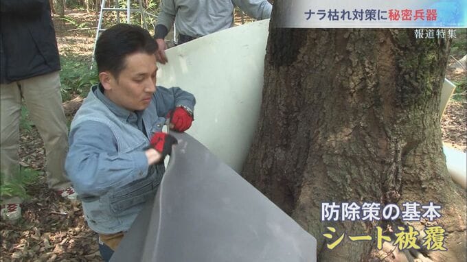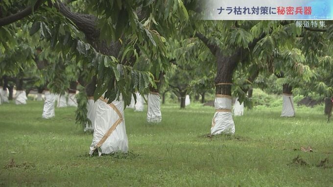 栗園は虫が入った形跡のある木を中心にシートを巻き、この夏、それらは守られているという。