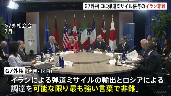 G7=主要7か国の外相は、イランがロシアに対し、弾道ミサイルの供与など支援を続けているとして、非難する声明を発表しました。G7の外相は14日、「イランによる弾道ミサイルの輸出とロシアによる調達を可能な限り…