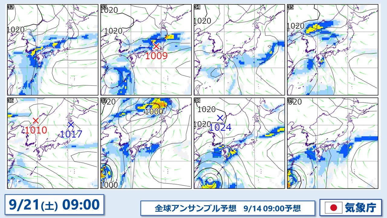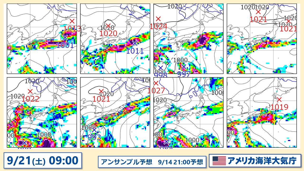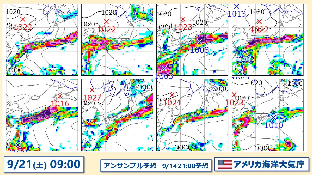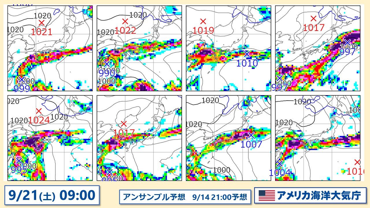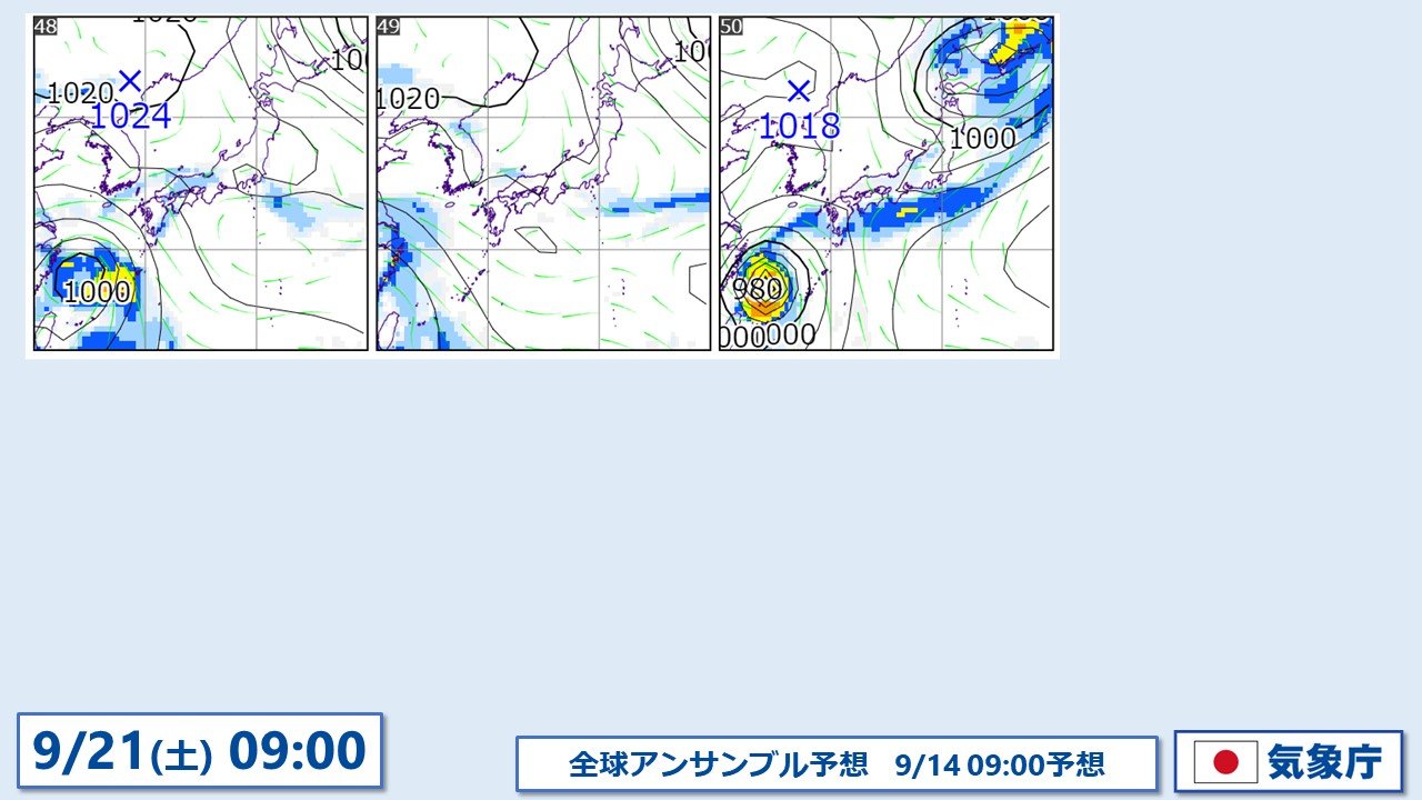 それでは気象庁、アメリカ海洋大気庁、ヨーロッパ中期予報センターのアンサンブル予報モデルについて、21日(土)朝の計算結果の一覧を見てみましょう。