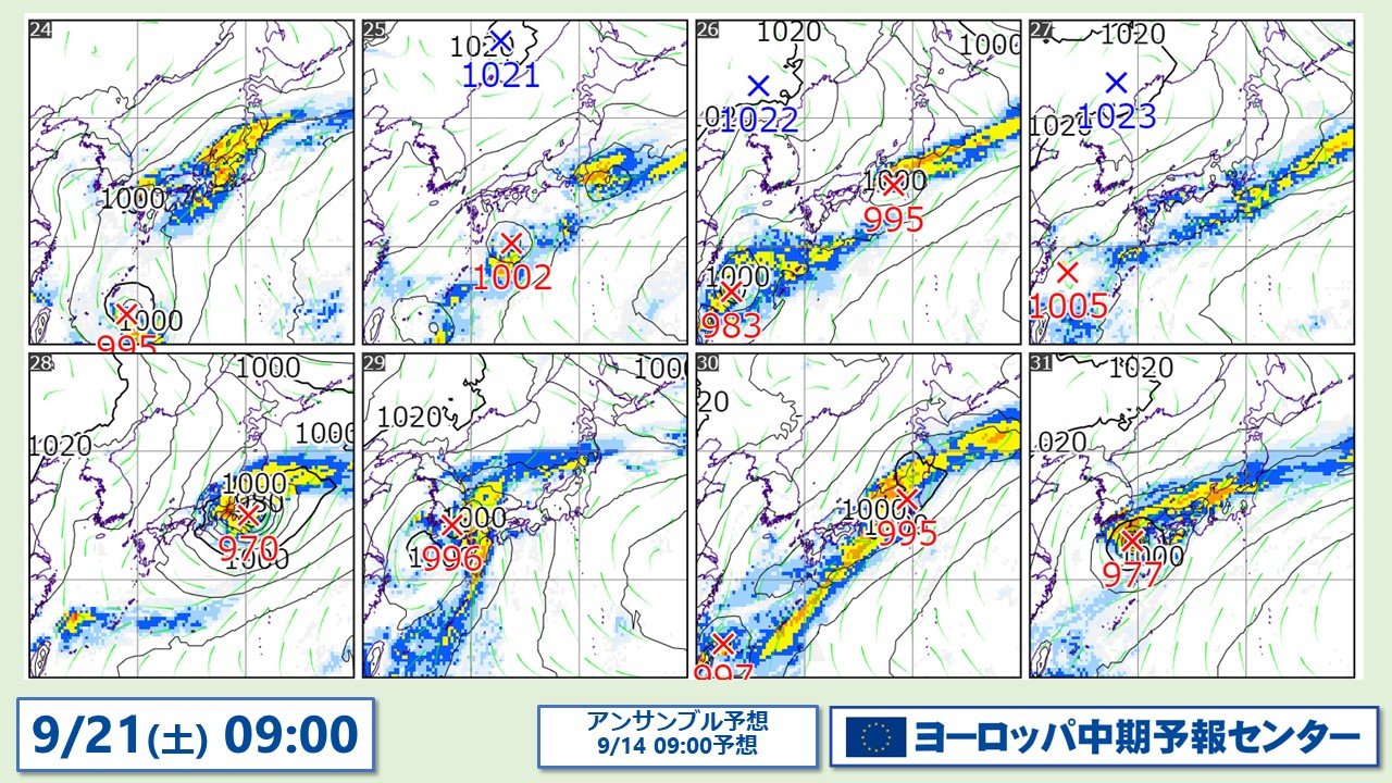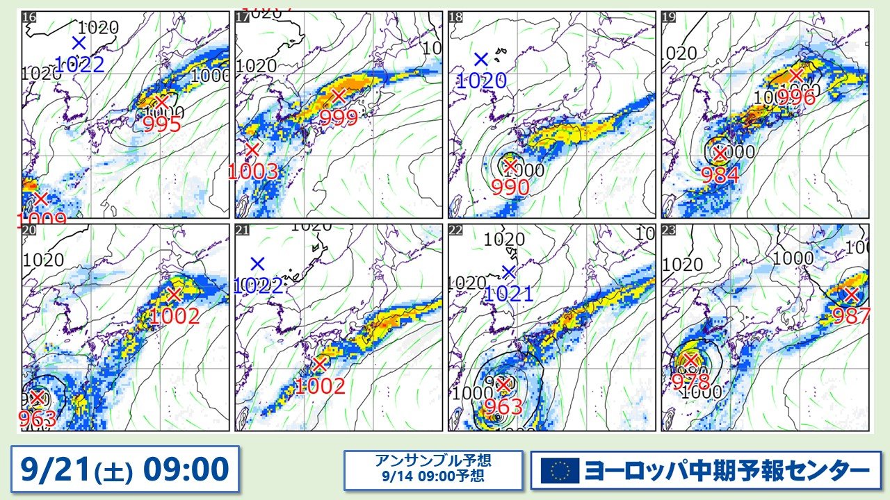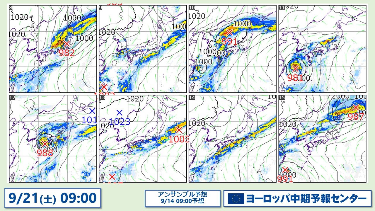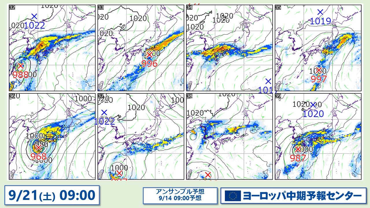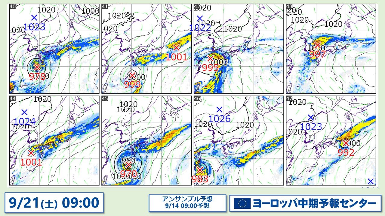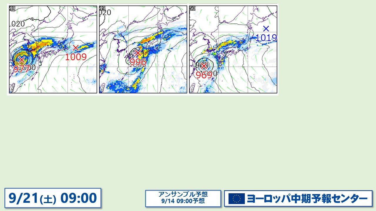 それでは気象庁、アメリカ海洋大気庁、ヨーロッパ中期予報センターのアンサンブル予報モデルについて、21日(土)朝の計算結果の一覧を見てみましょう。