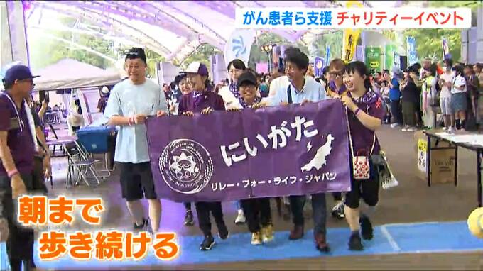 がん患者やその家族らがあすの朝まで、リレー形式で会場を歩き続けるイベントで、闘病中の人の勇気を讃え、がんで亡くなった人を偲び、がん征圧を願います。