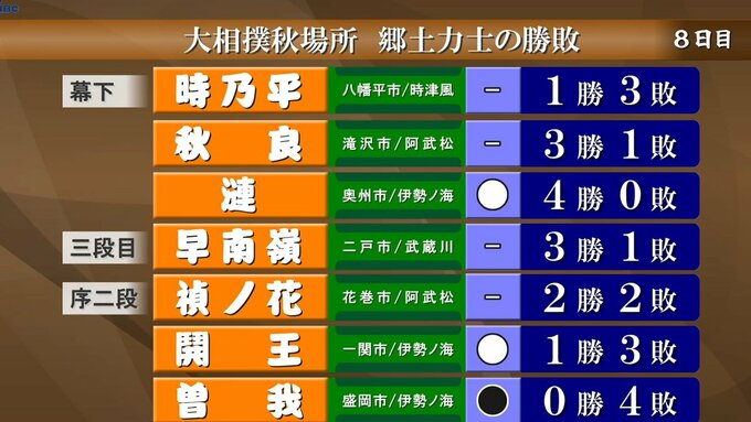 大相撲秋場所8日目・中日、岩手県出身力士の取り組みの結果です。14日に通算600勝を達成した西前頭13枚目盛岡市出身の錦木は北の若に小手投げで勝ちました。これで6勝2敗です。9日目は白熊との取り組みです。