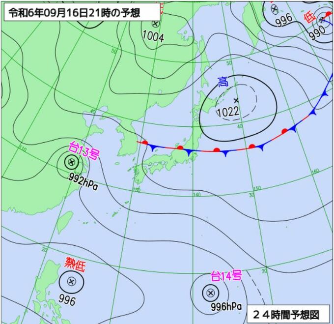 16日午前6時に時点では996ヘクトパスカルで北西へゆっくり進んでいます。この熱帯低気圧が台風へ発達するかどうかは、現時点で分かっておらず、今後の動向に注意が必要です。