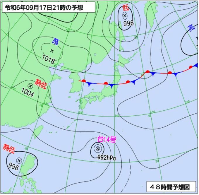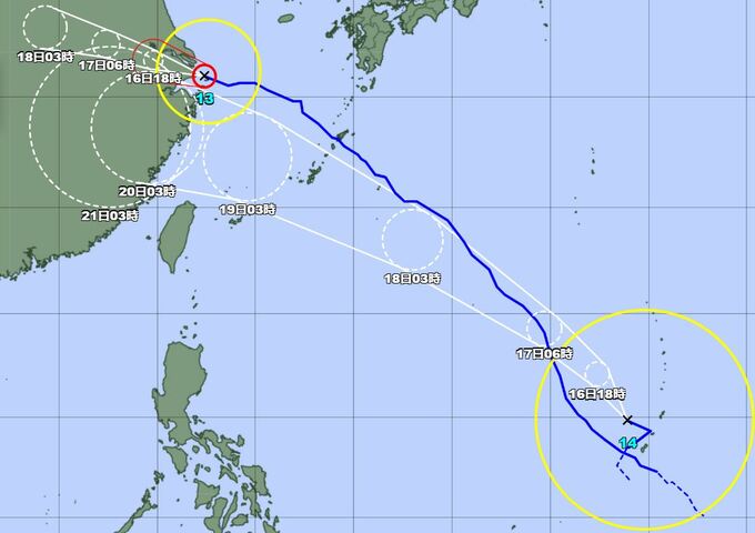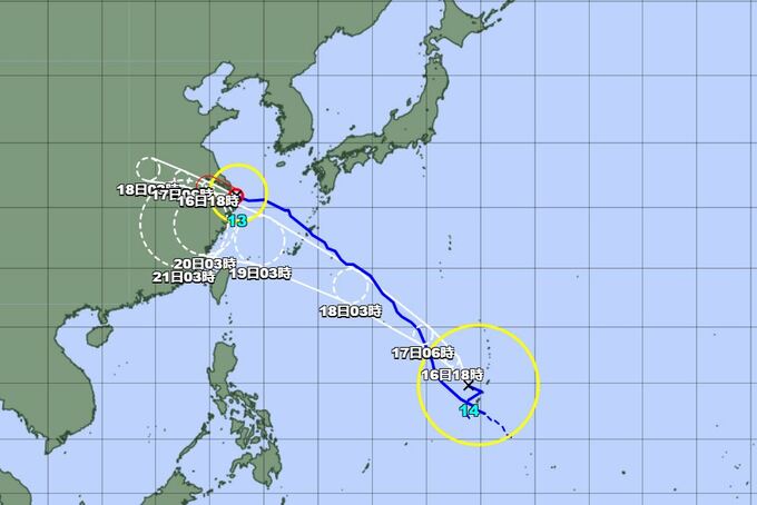 この台風は16日から17 日にかけて熱帯低気圧に変わる見込みです。南西諸島や西日本では台風の影響が残り、波が高くなる所がありそうです。南西諸島と西日本では16 日は、うねりを伴った高波に注意が必要です。