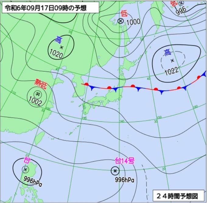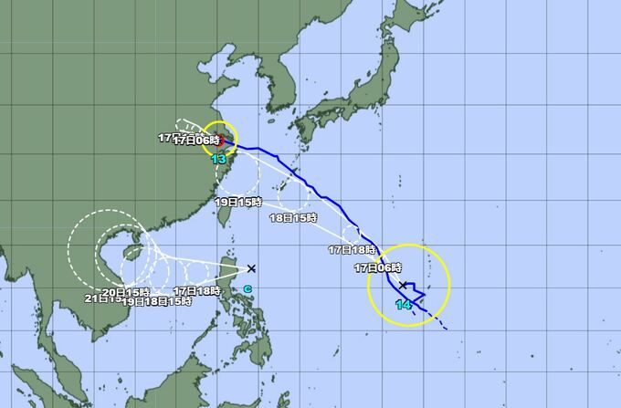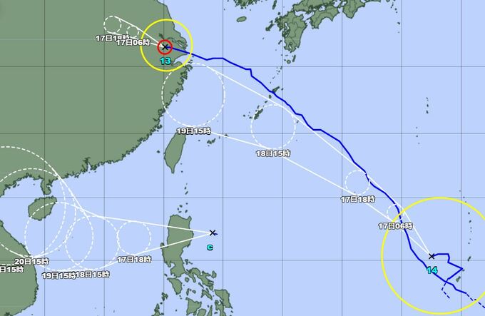 台風13号は16 日は華中を西寄りに進み、17 日には熱帯低気圧に変わる見込みです。南西諸島~九州付近では台風に向かって流れ込む暖かく湿った空気の影響が残り、16 日は大気の状態が不安定となるため、南西諸島~九州付近では 16 日は、落雷や突風に注意。また、南西諸島~西日本では 16 日は、うねりを伴った高波に注意が必要です。