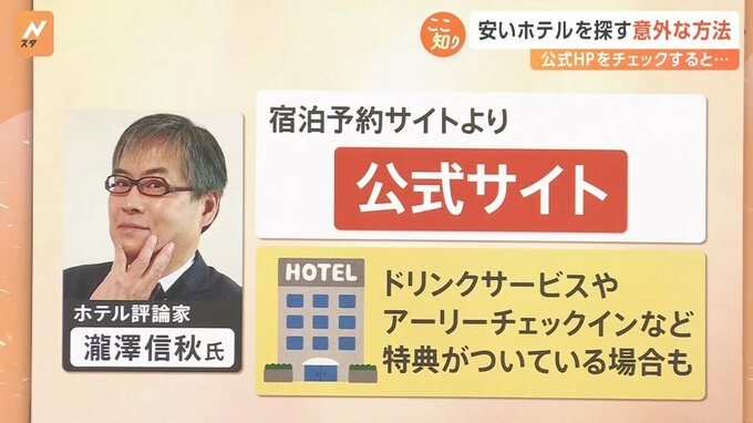 ホテル評論家の瀧澤信秋さんは「いまホテル・旅館に格安で泊まるのは難しい状況」だといいますが、宿泊サイトよりも公式サイトの方が安い場合もあり、さらにドリンクサービスやアーリーチェックインなど特典がついていることもあるそうです。