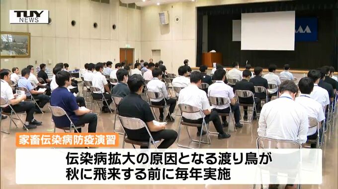 鳥インフルエンザなどの伝染病が拡大する原因と言われる渡り鳥の多くは、秋に日本にやってくるため、県は毎年渡り鳥が飛来する秋を前にこの演習を実施しています。