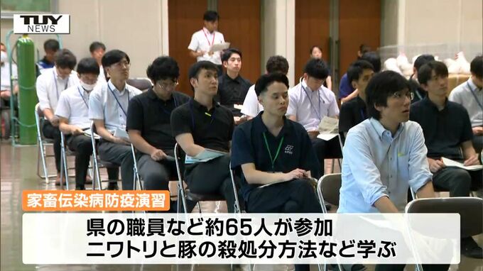 演習には、伝染病が農場で発生した時に実際に対応に当たる県の職員などおよそ65人が参加し、ニワトリと豚の殺処分の方法などについて学びました。