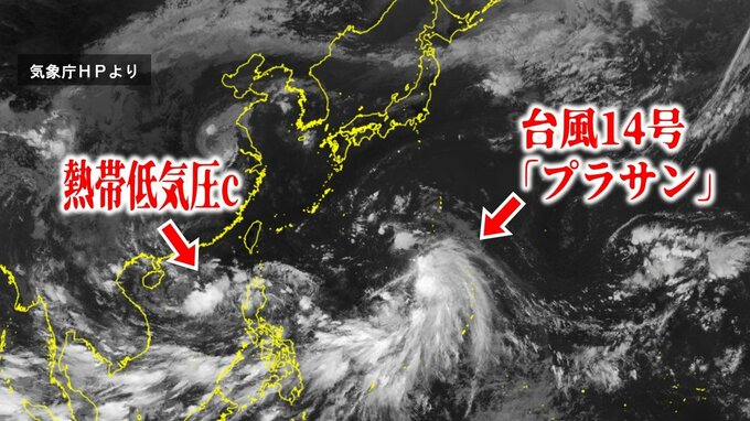 以下、気象庁が発表する「台風14号(プラサン)」と「熱帯低気圧c」の最新の実況と予想の詳細となります。