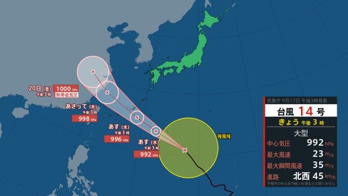 「大型」の「台風14号」は、北緯21度30分、東経136度10分を中心に『日本の南』で北西方向に時速55kmの速さで進んでいるとみられています。中心の気圧は992ヘクトパスカルで中心付近の最大風速は23メートル、最大瞬間風速は35メートルとなっています。台風の北東側600kmと南西側440kmが秒速15m以上の強風域となっています。