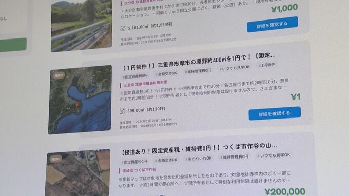 KLCが運営する「フィールドマッチング」は、不動産版のフリマサイト。売り手が価格を設定し掲載する仕組みで、中には1円という物件も。約35%は掲載から1年以内に売却されているといいます。
