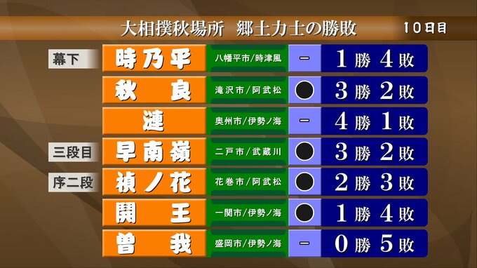 続いて大相撲秋場所10日目、郷土力士の取り組みの結果です。