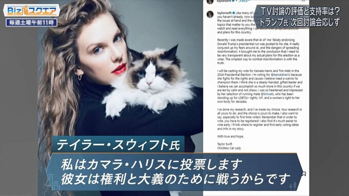こうした中、ハリス氏に強力な追い風も。世界的人気歌手でSNSのフォロワーが2億8300万人余りにのぼるテイラー・スウィフトさんがハリス氏への支持を表明した。「私はカマラ・ハリスに投票します。彼女は権利と大義のために戦うからです」。これにはトランプ氏も強がります。「私はテイラー・スウィフトのファンではなかった。彼女は代償を払うことになるだろう」。