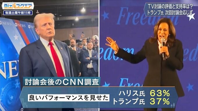 アメリカ大統領選の行方を左右するテレビ討論会。双方の支持者に話を聞いた。民主党支持者は「10点満点で9.5点。前回の(バイデン大統領の)討論会はショックで落ち込んだけれど、きょうは場外ホームランで大成功」。共和党支持者は「トランプ候補はもっと無党派層にアピールできたはずだがみんな彼の実績を分かっているから問題ない」。