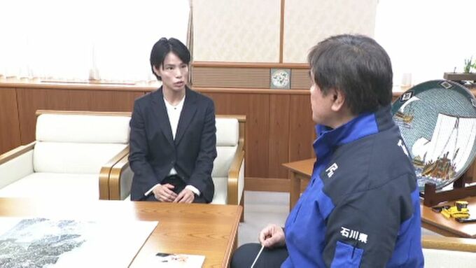 松本さんは17日石川県庁を訪れ、能登半島地震からの復興に役立ててもらおうと、馳知事に義援金を手渡しました。