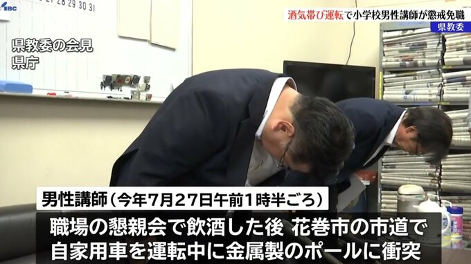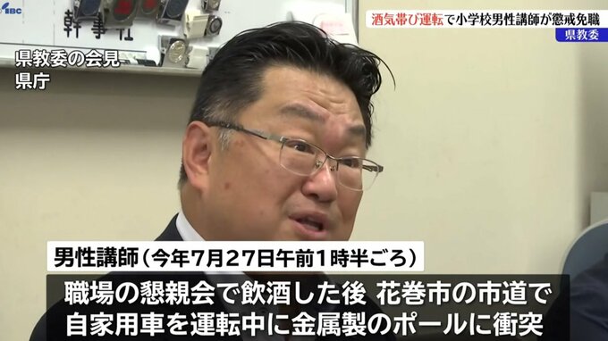 岩手県教育委員会は17日、7月に酒気帯び運転をした岩手県花巻市の小学校に勤務する男性講師を懲戒免職処分にしたと発表しました。