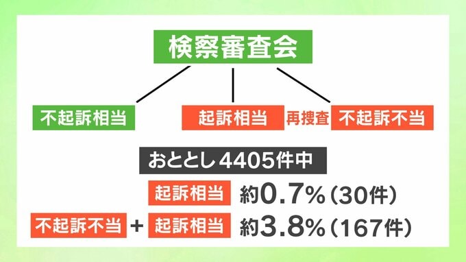 ちなみに、全国では2022年、4405件が審議され、起訴相当は30件でおよそ0.7%、不起訴不当と合わせても167件、3.8%にとどまっています。