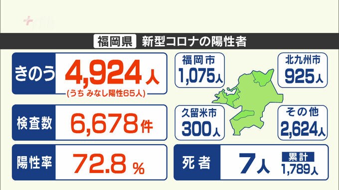 福岡県が発表した4日の陽性者は4924人で、60代以上の男女7人が死亡しました。陽性者が5000人を下回るのは7月19日以来となります。一方、佐賀県では752人の新規陽性者が確認されています。亡…