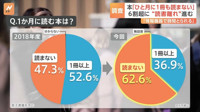 “読書離れ”が進んでいます。本を1か月に1冊も読まないという人が6割を超えたという調査結果を、文化庁がきょう公表しました。読まない派 大学生(19)「めったに読みませんね」読まない派 歯科衛生士(20代)…