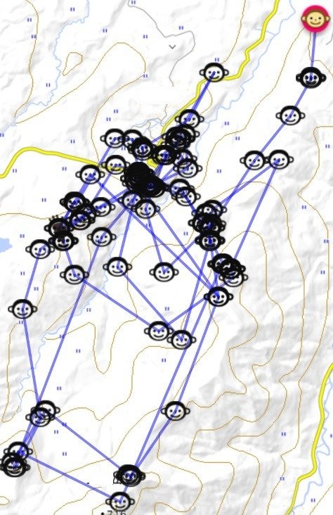 インターネット上のマップに表示された色付きの“サルの顔”のマークは「群れの直近の居場所」。直線は、これまでの群れの「移動経路」を表しています。