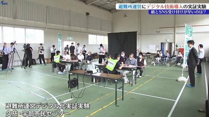 実験には地域の人たちも参加し、避難所の受け付けを紙を使ったアナログ式とSNSのLINEを使ったデジタル式の2通りで行い、それぞれにかかった時間を測りました。