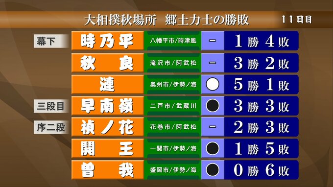 大相撲秋場所11日目、郷土力士の取り組みの結果です。