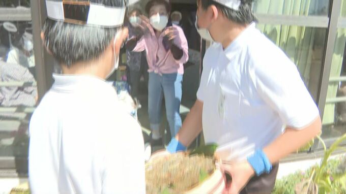 18日、山口県上関町特産で長寿の象徴ともされるエビと子どもたちの元気が、お年寄りに贈られました。