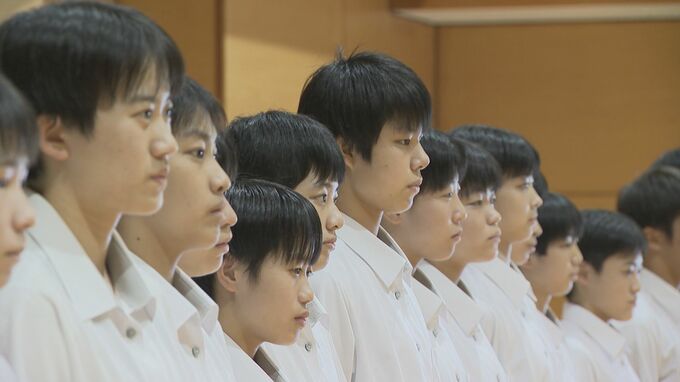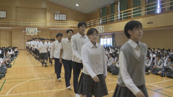 壮行会では降矢麗子校長が「山口県の代表として全力を尽くしてほしい」と激励。それぞれの部のキャプテンが大会での目標を述べ、健闘を誓いました。