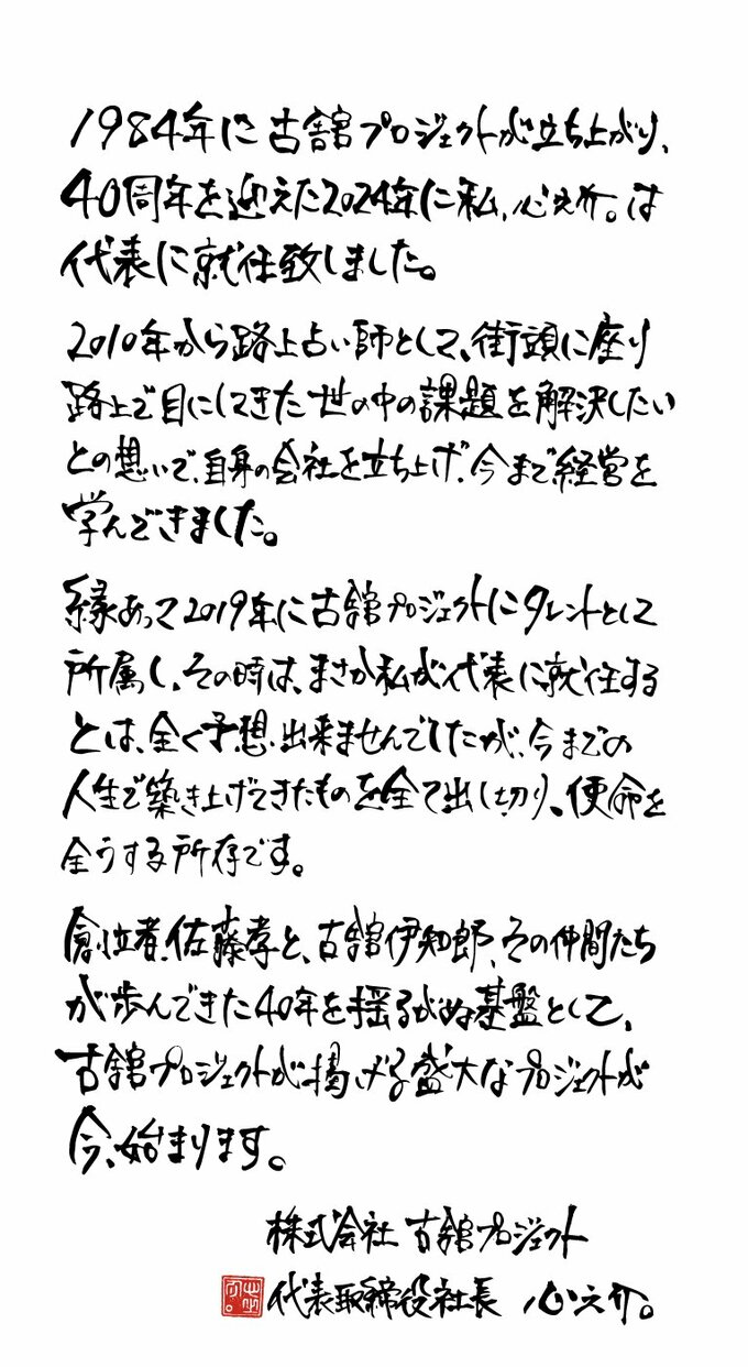 2024年9月、タレントとして所属している芸能事務所「古舘プロジェクト」の代表取締役社長に心之介。が就任致しました。