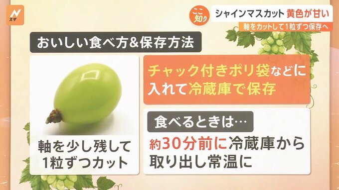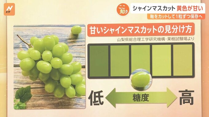 旬を迎えているシャインマスカットですが、色で甘さがわかるということです。