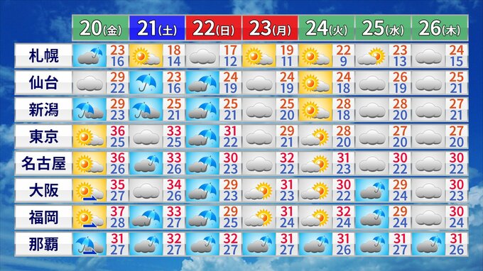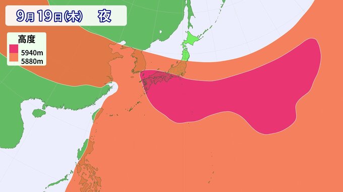 太平洋高気圧がようやく力尽き、秋の空気が入りやすくなるため、猛烈な暑さはあす20日(金)峠を越える見込みです。