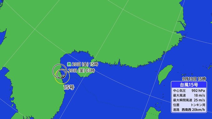 この台風15号は、19日午後3時時点でトンキン湾にあり、1時間に約25キロの速さで北西へ進んでいます。