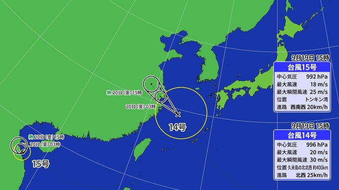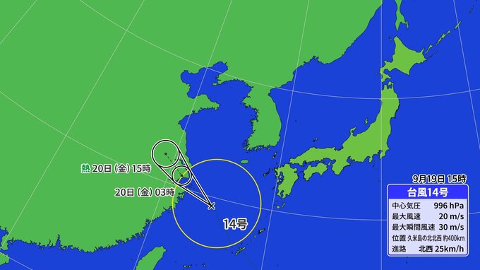また、「台風14号 プラサン」は、19日午後3時点で沖縄県の久米島の北北西約400kmにあり、1時間に25キロの速さで北西へ進んでいます。