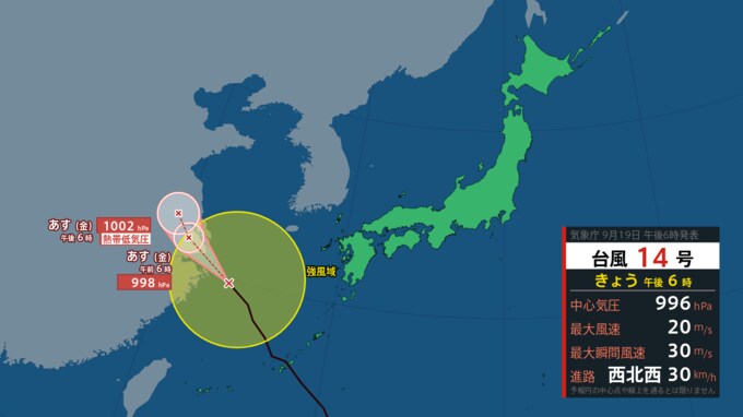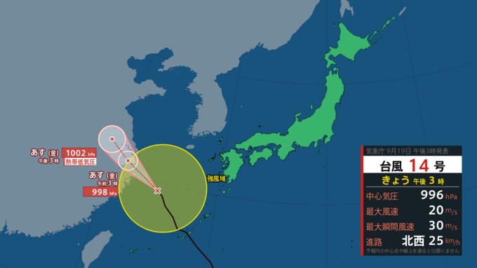 「台風14号」は、北緯29度50分、東経123度40分を中心に『東シナ海』で西北西方向に時速30kmの速さで進んでいるとみられています。中心の気圧は996ヘクトパスカルで中心付近の最大風速は20メートル、最大瞬間風速は30メートルとなっています。台風の北東側440kmと南西側330kmが秒速15m以上の強風域となっています。
