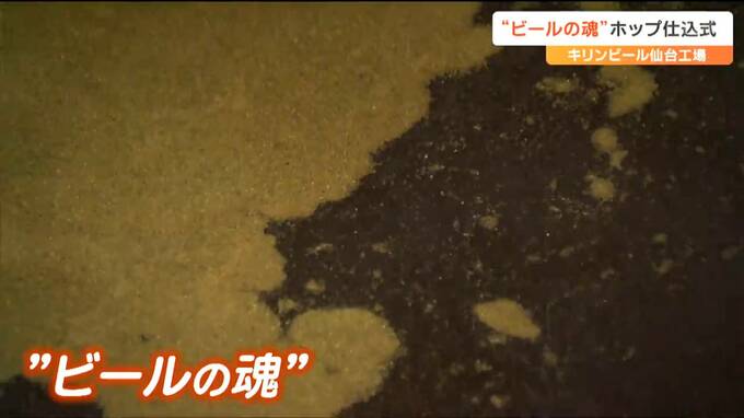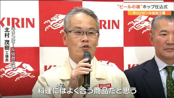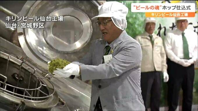 仙台市宮城野区のキリンビール仙台工場では、工場長や岩手県遠野市の多田一彦市長らが遠野市で収穫されたホップを釜に入れていきました。