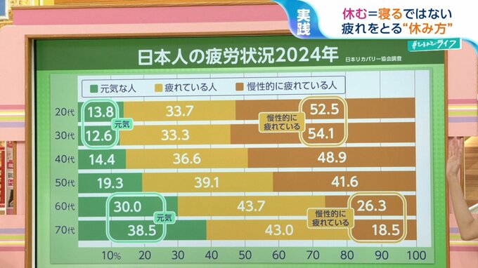 日本リカバリー協会の調査によると、60代・70代は3割以上が元気なのに対し、20代・30代で元気な人は15%にも満たないという結果に。