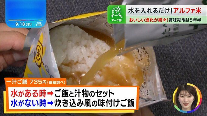 無事食べることができた一ノ瀬さんは、「もちもち。お米の食感がしっかり残っているし、やさしい味付けでおいしい」と感激。安住アナも「賞味期限5年半で270円だし、水で戻るのがスゴイよね」と驚いた様子で話していた。