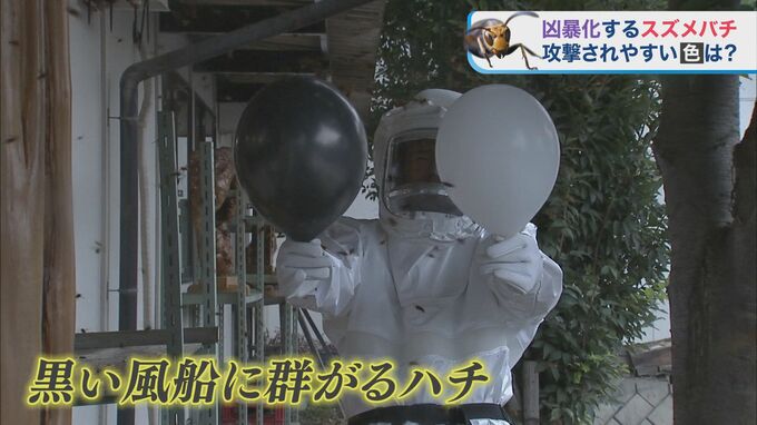 スズメバチが飛び交う中、白と黒の風船を同時に近づけると、ハチは黒い風船の周りに群がります。実験では、黒い風船だけが割れました。白色と黒色を区別して針を刺したことがわかります。