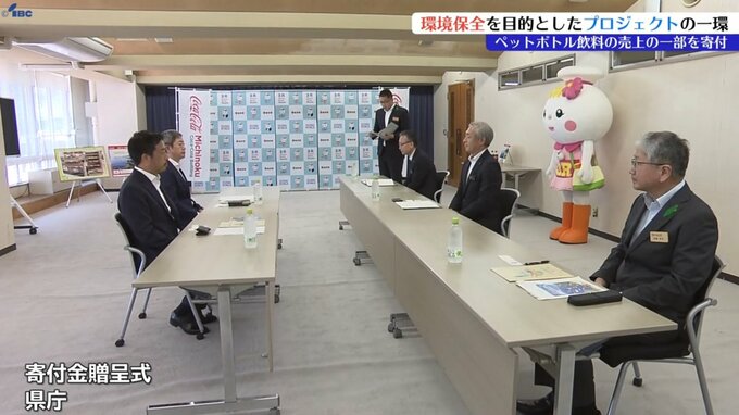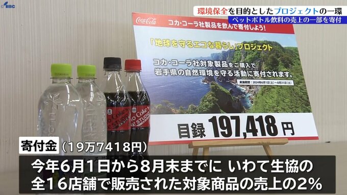 岩手県内の飲料メーカーと生協が共同で進める環境保全を目的としたプロジェクトの一環で、ペットボトル飲料の売上の一部が県に寄付されました。