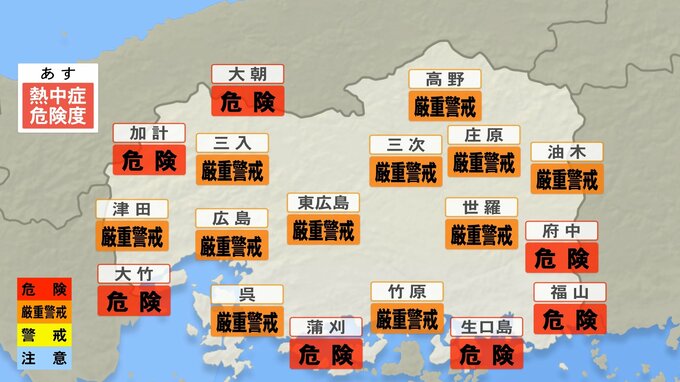 きょう19日(木)の広島県は、県内9地点で猛暑日を記録し、県内の観測史上最も遅い猛暑日の記録をきょうも更新しました。最高気温は、府中市で37.4℃ 加計で37.2℃ 広島市中区で35.7℃でした。きょうでことしの府中市の合計の猛暑日日数は53日となり、全国で4位の猛暑日日数になっています。