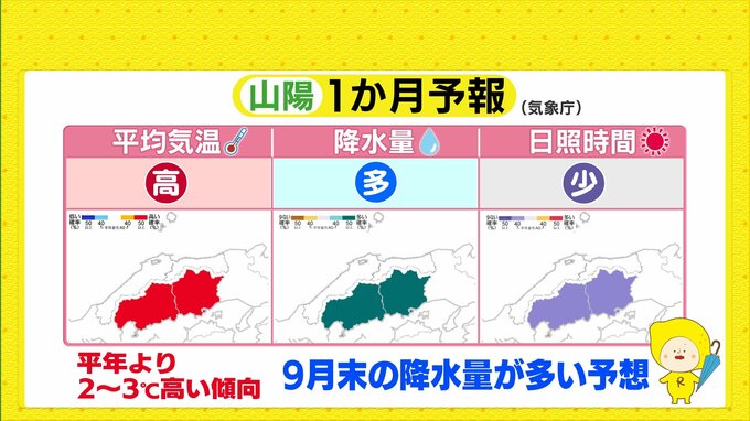 この異常な残暑ですが、あすまで我慢が必要となります。土曜日以降は秋雨前線が南下し、猛烈な残暑は落ち着きますが、それでも平年よりも2~3℃高い傾向は向こう一ヶ月続く予想です。そして9月下旬の雨量が平年よりも多い予想で、季節の変わり目の雨の時期が平年より遅れてやってくる見込みです。猛烈な残暑の圧は、雨の情報にも注意が必要になりそうですね。